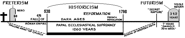 The result is evidenced from this diagram, which shows all three teachings concerning antichrist. Alcazar's Preterism identifies the antichrist as Nero while Ribera's futurism puts the antichrist into a future 3.5 literal years. Both interpretations put antichrist outside the Middle Ages and the reformation period, identified by Protestant historicists as the 1260 prophetic year reign of antichrist.